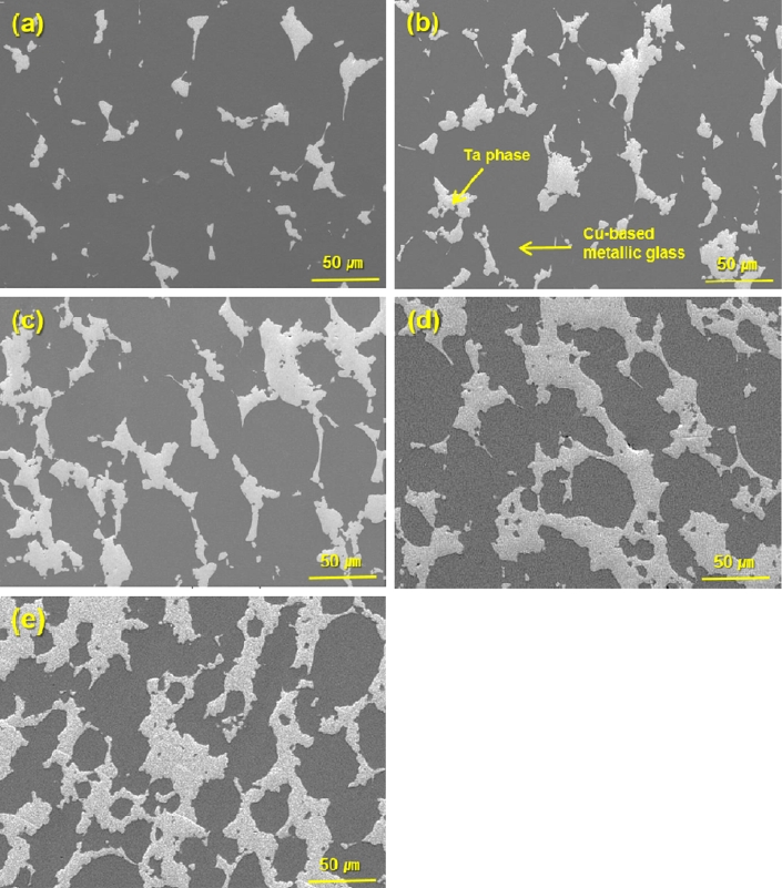 그림 3은 방전플라즈마 소결법에 의해 제조된 Ta(10, 20, 30, 40, 50 wt%)을 포함하는 Cu54Ni6Zr22Ti18 벌크 비정질 복합재의 미세조직 사진을 보여주고 있다. 제 2상인 Ta 상이 Cu54Ni6Zr22Ti18 비정질 기지에 균일하게 분포되어 있으며, 계면의 경우 결함이나 기공 등이 없는 건전한 미세조직을 보여주고 있다. 이러한 건전하고 치밀한 미세조직은
