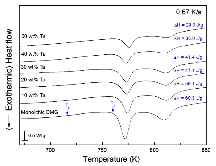 반응을 나타내고 있다. Ta 상을 함유한 비정질 복합재의 유리전이 온도(Tg)와 결정화 온도(Tx)는 Cu계 벌크 비정질 합금과 유사한 값을 가지며, 동일한 열적 거동을 나타내고 있다. 또한 50 wt% Ta을 함유한 비정질 복합재의 경우 결정화
