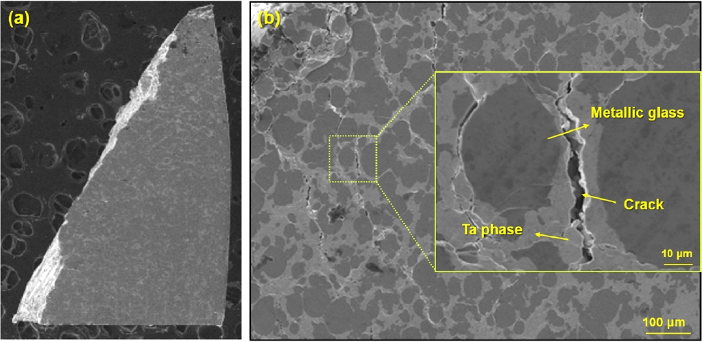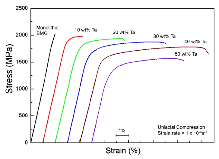 최근 연구에 따르면 주조 공정에 의한 벌크 비정질 기지 복합소재에 Ta이 제 2상으로 ex-situ 방법에 의해 첨가된 경우, 소성 변형 영역이 향상된