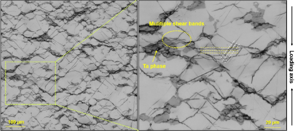 이 영역으로부터 전단 띠가 발생하게 되고, 이러한 전단 띠는 기지 내부를 통해서 이동하다가 또 다른 Ta 상을 만나거나 다른 전단 띠를 만나는 경우