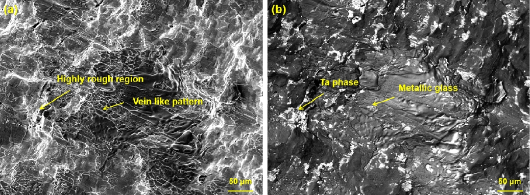 SEM micrographs of fracture surface obtained from Cu54Ni6Zr22Ti18 BMG composites containing 40 wt% Ta phase: (a) secondary electron image, and (b)