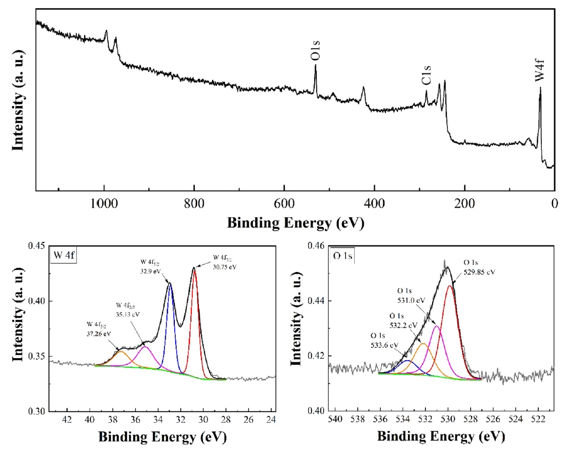 그림 6은 수소환원한 분말의 XPS wide scan과 W4f, O1s의 narrow scan 스펙트럼을 나타낸 결과이며, 모든 스펙트럼의 peak는 C1s(284.5eV)을