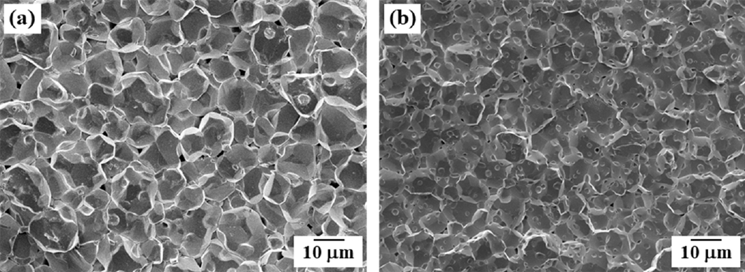 비교를 위해 평균 입도 1.22 μm의 상용 W 분말을 동일한 조건으로 소결하였다. 그림 7(a)와 (b)는 각각 초음파 분무 열분해법 및 상용 분말을 소결한 시편의 파단면 사진으로, 두 시편 모두 약 10 μm의 결정립 크기를 나타내며 입계 등에서 일부