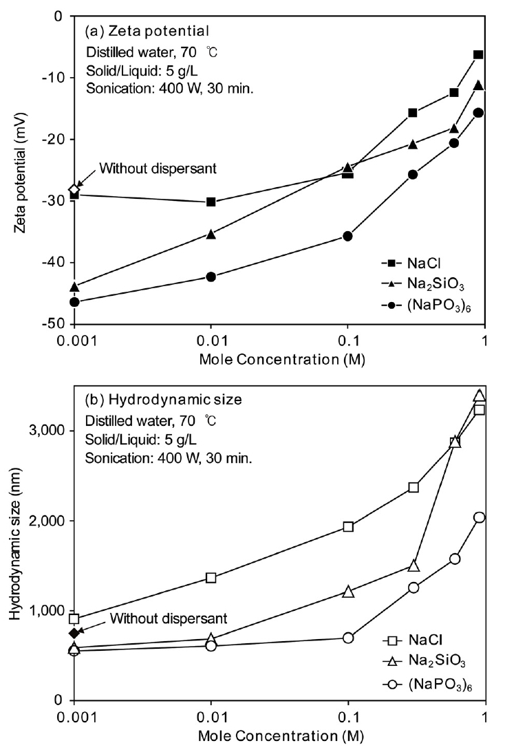 그림 10에는 분산제인 NaCl, Na2SiO3, (NaPO3)6의 첨가량에 따른 zeta potential(a)과 hydrodynamic size(b)의 변화를 비교하여 나타내었다. 전체적으로 zeta potential과