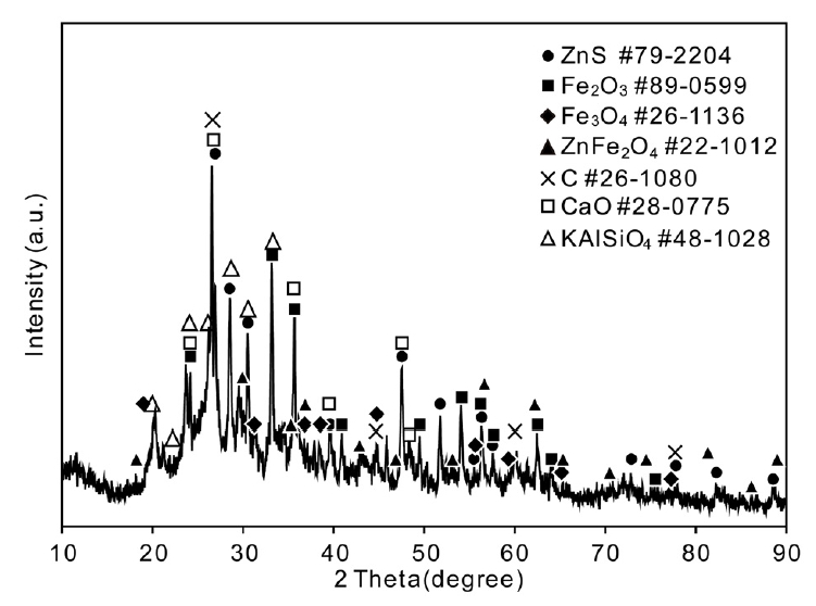그림 2에는 본 실험에 사용한 고로 슬러지 입자의 X-선회절 분석 결과를 나타내었다. 표 1에 나타낸 ICP 분석결과와 마찬가지로 C, Zn, Fe, Al, Ca 등이 검출되었다. Zn의 경우 대부분 황화물로, Fe는 Fe2O3 및 Fe3O4의 형태의 산화물로 존재하였으나 ZnFe2O4 형태의 복합 산화물도 검출되었다. Al, K, Si은 대부분 복합 산화물 형태로 존재하였다.