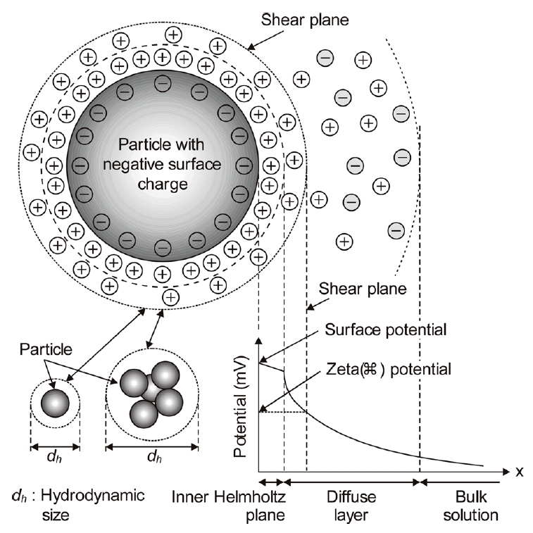 그림 4에 zeta potential과 hydrodynamic size를 모식적으로 나타내었다. zeta potential은 현탁액 중 입자에 존재하는 전기
