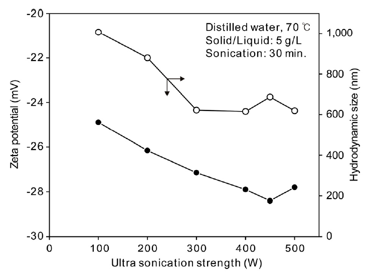 측정할 수 없었으며, 초음파 분산 강도가 300~400W 이상에서는 zeta potential 및 hydrodynamic size가 유사였다. 그리고