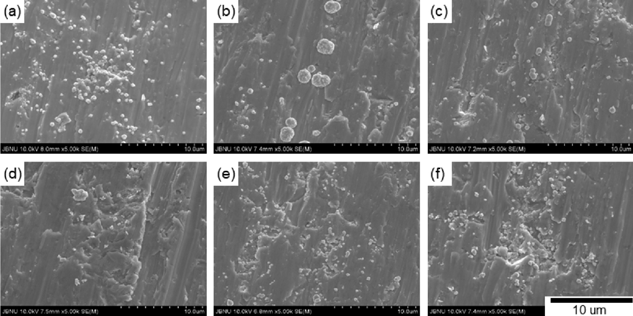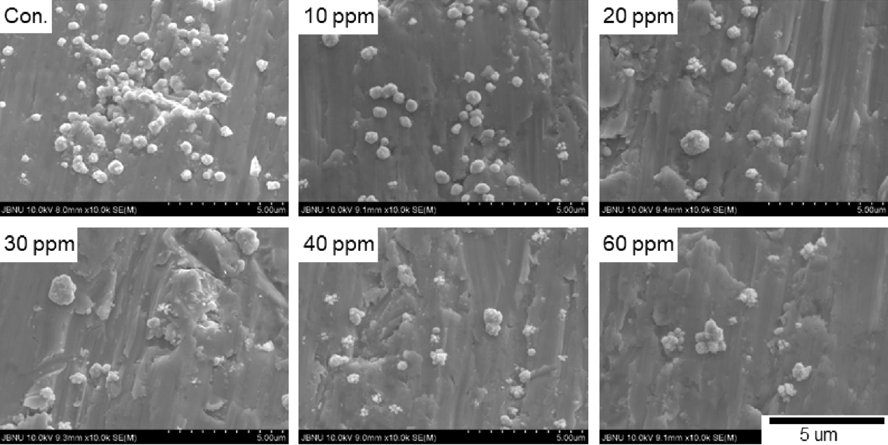 ์ฒจ๊ฐํ ๊ฒฝ์ฐ๋ฅผ ์ ์ธํ๊ณ ๋ ์ผํ์ด์จ์ ์ฒจ๊ฐํ์๋ ์กฐ๊ฑด๋๋น ๋ฎ์ ์ ์์ ๋ณด์ด๊ณ ์๋ค. ํ๋ฉด์ ๊ด์ฐฐํ ๊ฒฐ๊ณผ์ธ ๊ทธ๋ฆผ 5๋ฅผ ๋ณด๋ฉด ์ฒจ๊ฐ๋์ด 10 ppm๋ณด๋ค ์ฆ๊ฐ๋๋ฉด์ ๊ฒฐ์ ์ด ๋ญ์น๋ ํ์์ ๋ณด์ด๊ณ ์์ผ๋ฉฐ, ํ๋ฉด์์ ๋ณ๋ชจ์์ ๊ฒฐ์ ๋ค์ด ํ์ฑ๋๊ณ ์๋ค. MPSA 60 ppm์