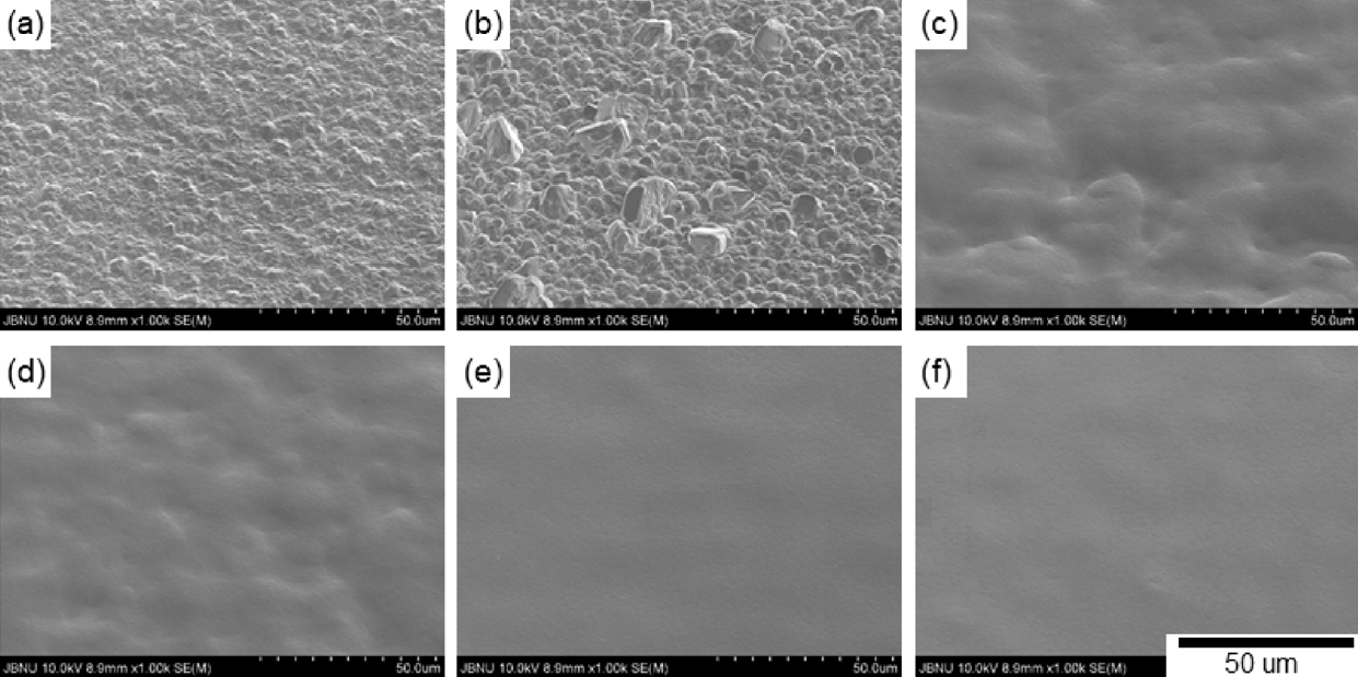 (c), (d)๊ตฐ์์๋ ํ๋ฉด์ ๊ฒฐ์ ์ด ํ์ธ๋์ง๋ ์์์ผ๋, ํ๋ฉด์ด ํํํ์ง ์๊ณ ๊ณจ์ด ์กด์ฌํ์๋ค. ํํ์ ๋ฅผ ์ฒจ๊ฐํ ๊ฒฝ์ฐ ์ด๋ฌํ ๊ณจ์ ์ค์ด๋ค๊ณ ํํํ