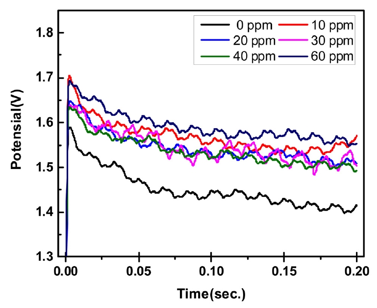 ํ์ฑ๋๋ ์ ์์ด ์ฒจ๊ฐ๋์ด 40 ppm๊น์ง ์์ํ ๊ฐ์ํ๋ค 60 ppm์ ๊ฒฝ์ฐ์๋ 10 ppm๋ณด๋ค ๋์ ์ ์์ ๋ณด์ด๊ณ ์๋ค. ๊ทธ๋ฌ๋ MPSA 60 ppm์