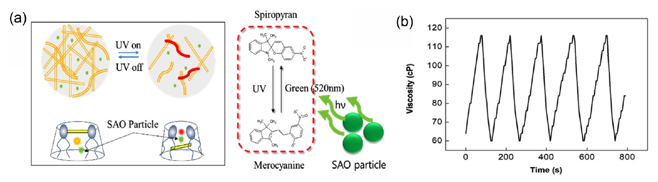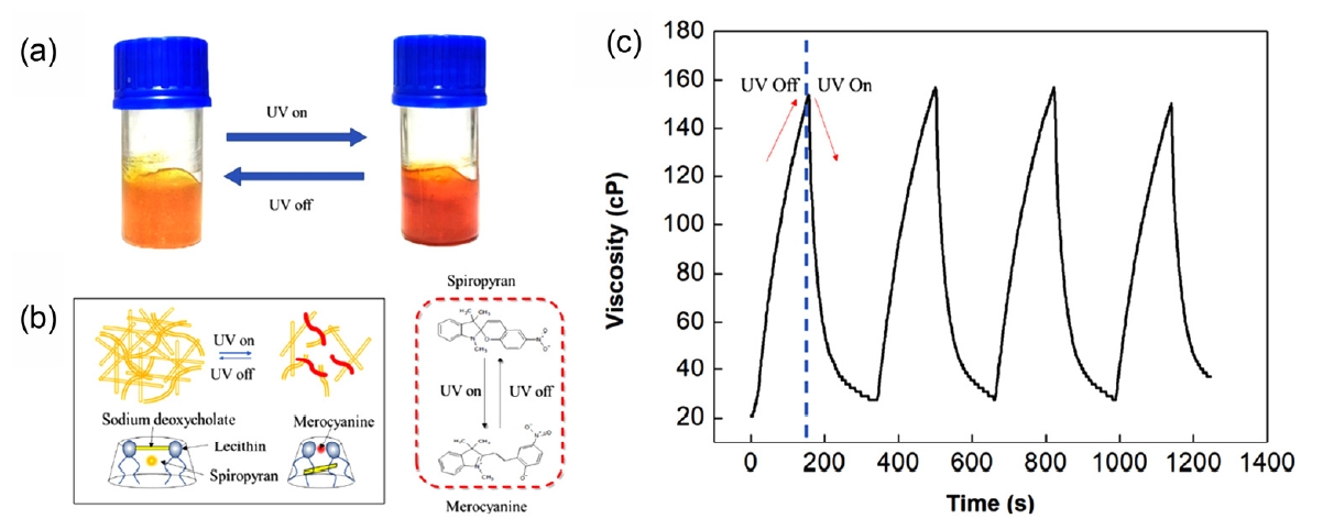 in color, from yellow to red, as illustrated in Fig 1(a). The aforementioned changes in microstructure are illustrated in Fig 1(b), while the measured cyclic viscosity response under light off and on is depicted