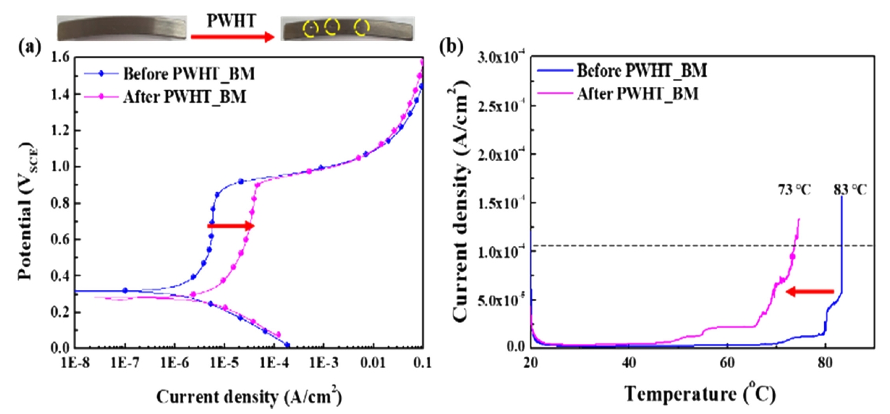 (a) Potentiodynamic polarization curves of the base metal before and after PWHT, evaluated