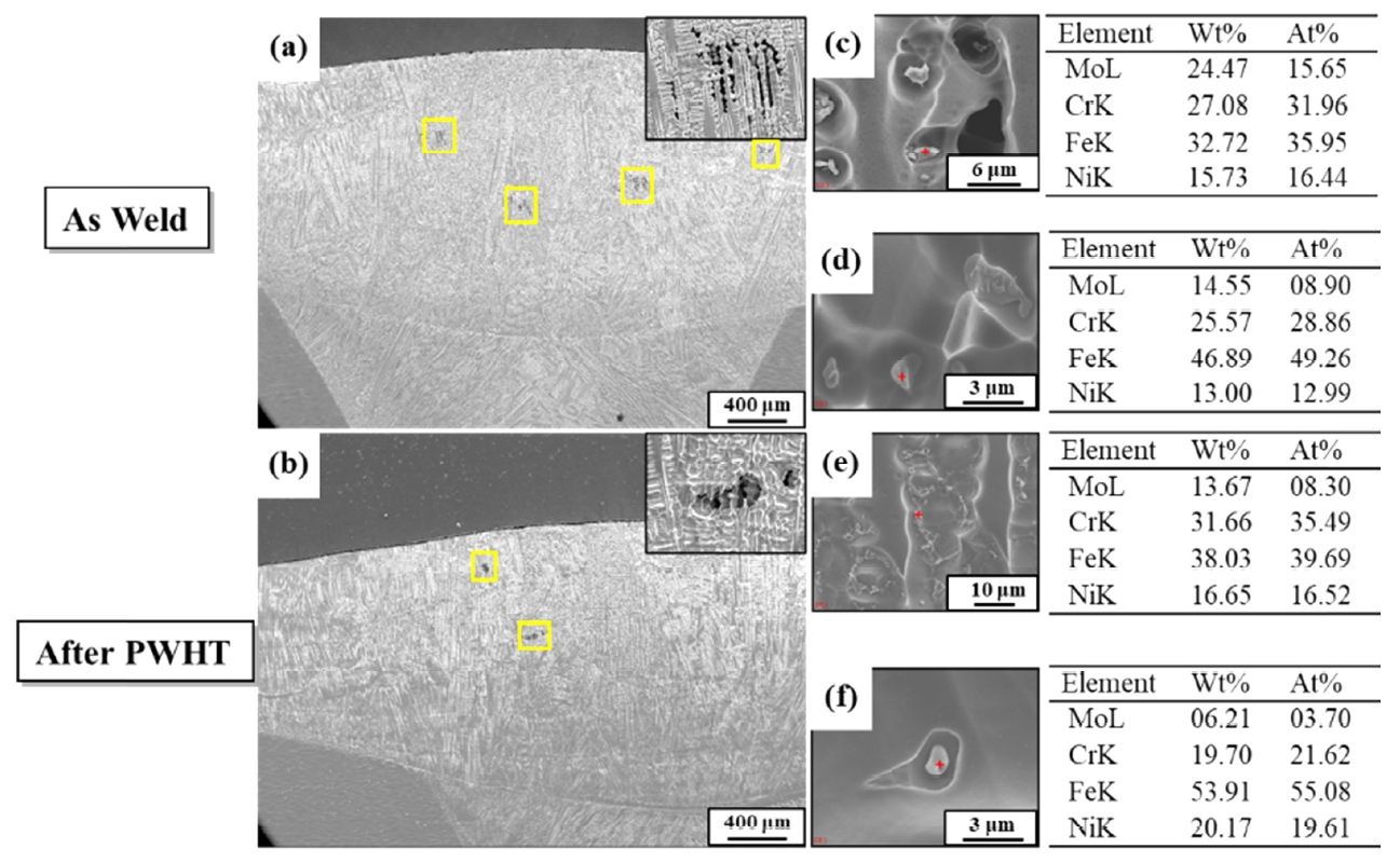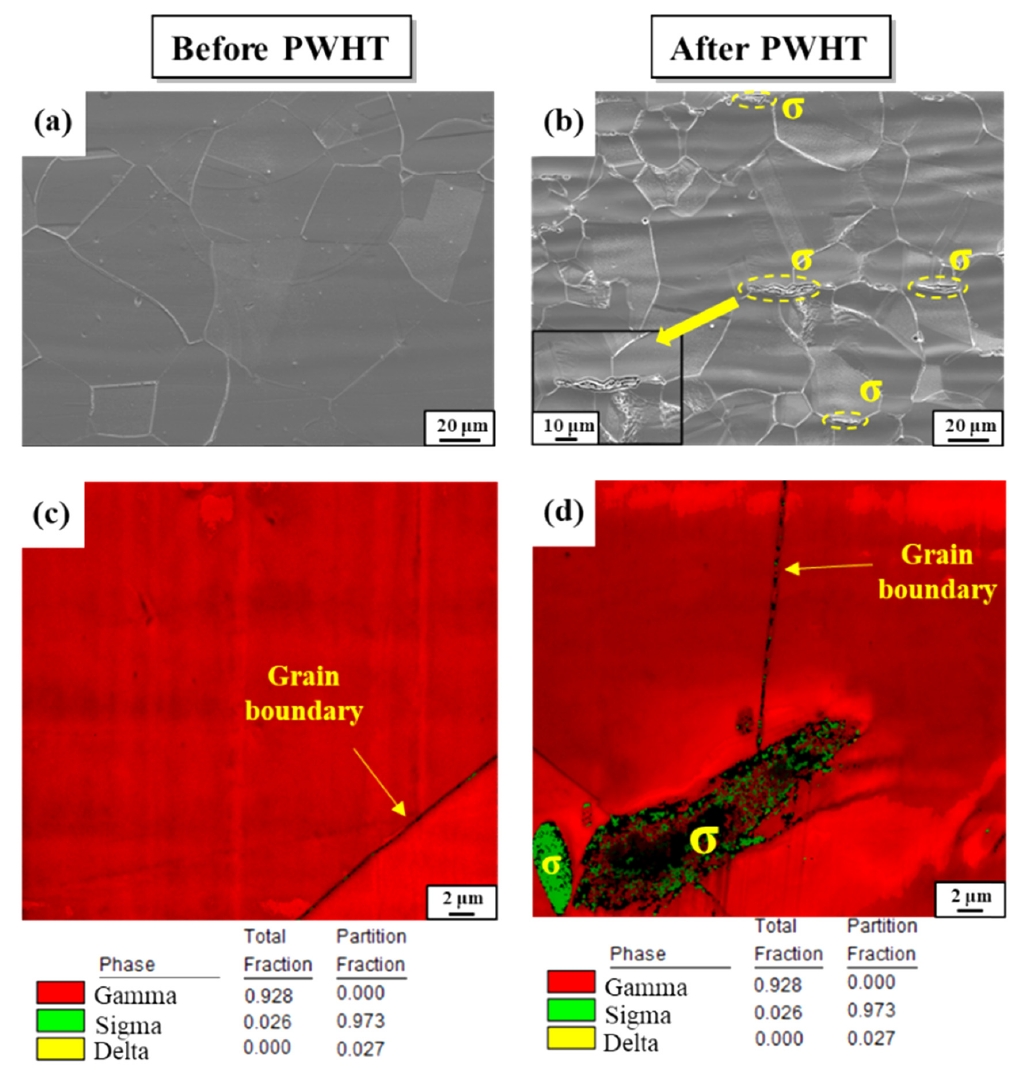 경우에도 이차상의 형성을 저감시키기 위해 용접 후 열처리(post weld heat treatment, PWHT)가 수행되어지고 있다 [28-31]. 하지만 실제 산업 내에서 후열처리 수행 시 용접부 뿐만 아니라 모재 영역 또한 열이력을 받기 때문에 후 열처리 및 냉각까지의 프로세스 과정에서
