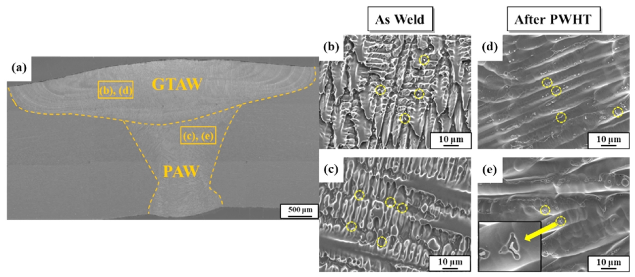 불구하고 용접 후 열처리 시편 GTAW 영역(상단부) 내 (그림 3(d)) 이차상이 미량 잔존하고 있으나, PAW 영역 (하단부) 내에서는 (그림 3(e)) 이차상의 존재 확인이 쉽지 않았다. 즉, 본 연구에서 수행한 용접 후 열처리 공정은 상기 언급한 석출 이차상의 재용해를 통해 그 분율을 저감시키는