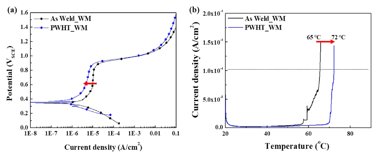 (a) Potentiodynamic polarization curves of welded joint in as-welded and post weld