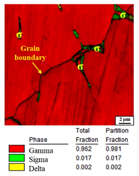 Precipitation of the σ phase along the grain boundary in PAW region, analyzed by EBSD.