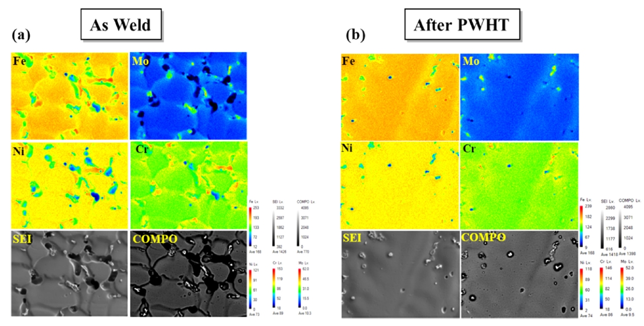 EPMA mapping of GTAW region in (a) as-welded and (b) after PWHT conditions.