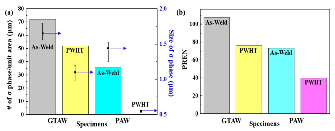 보고되고 있다 [41-44]. 한편, 본 연구에서 특히 주목할 부분은, σ 상 내 Cr 및 Mo의 함량이 모재의 제살 용접에 해당되는 PAW 대비 GTAW에서 보다 높은 것으로