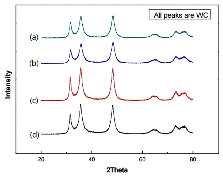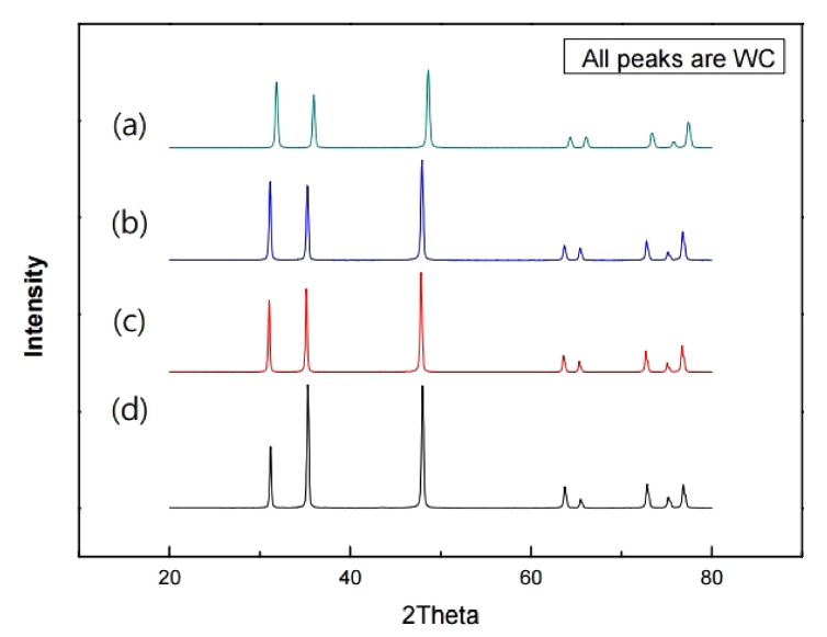 이것은 알루미늄이 소결 중에 액상이 되어서 텅스텐 카바이드가 재배열이 되고 원자의 확산이 용이하기 때문으로 생각된다 [22]. 그림 7은 1500 °C로 가열한 소결체 X-선 회절 패턴을 나타낸 것이다. X-선 회절 패턴에서는 WC 피크만 관찰되었다. 그리고 X-선 회절 피크 반가폭이