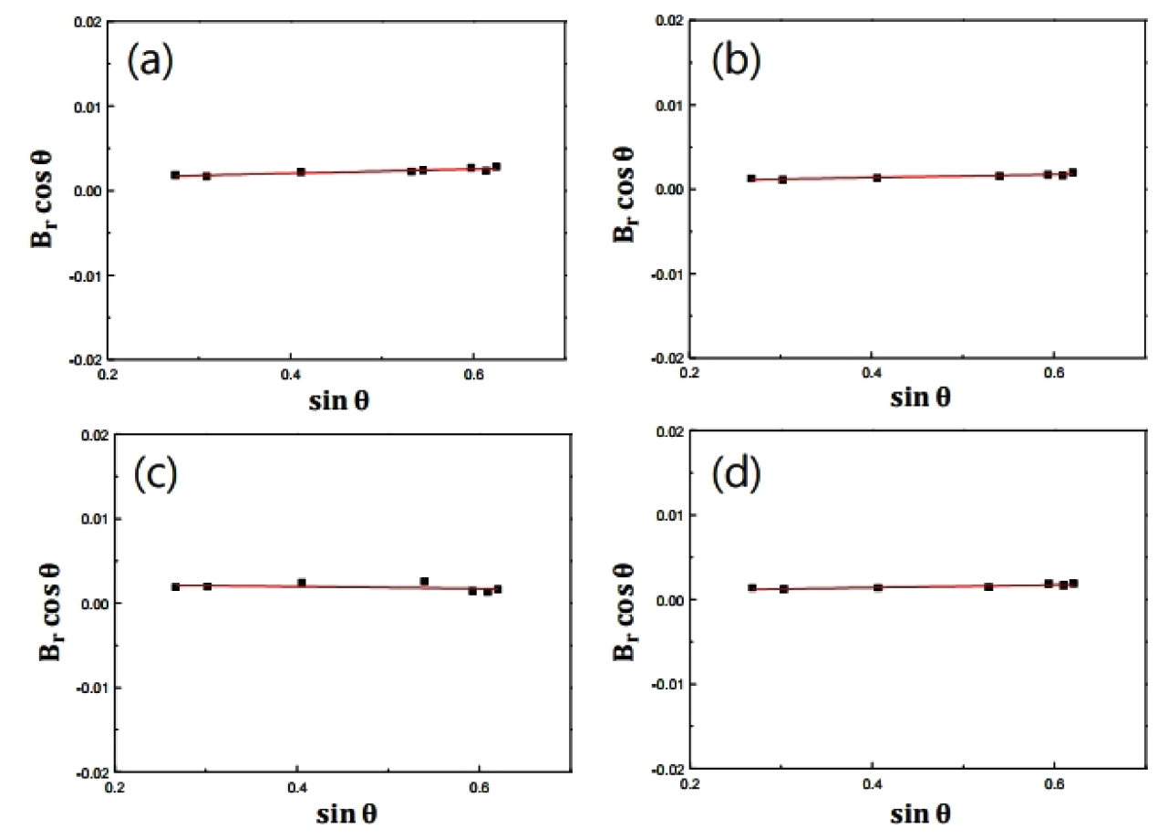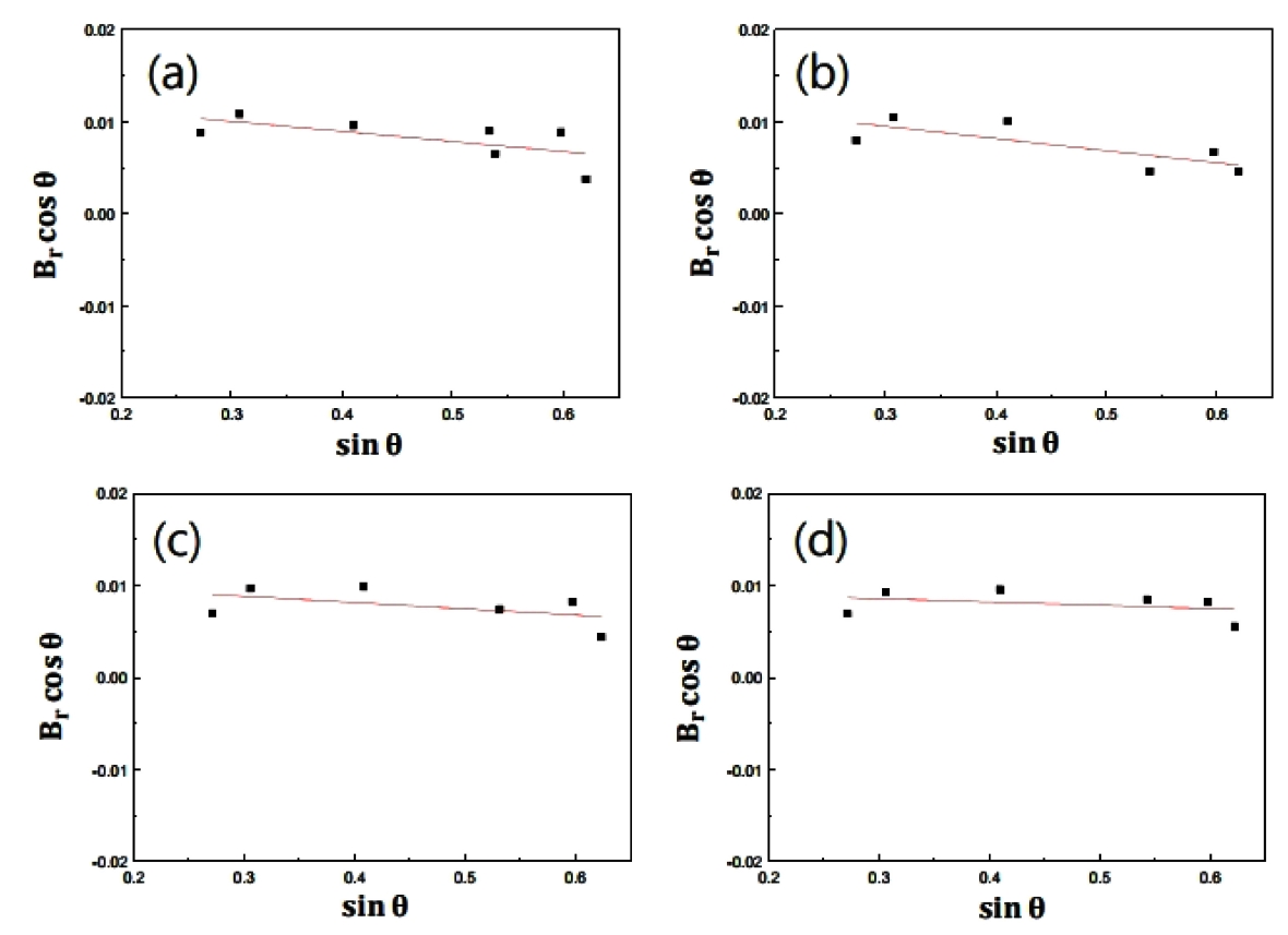 작아진 것은 소결 중에 입자 성장이 일어났음을 판단할 수 있다. 그림 8은 소결한 복합재료에서 텅스텐 카바이드의 결정립 크기를 Suryanarayana 식 [20]을 이용하여 평가하기 위해 sinθ에 대한 Br·cosθ를 나타낸 것이다. 소결한 WC-5vol.% graphene-x vol.% Al (x=0,