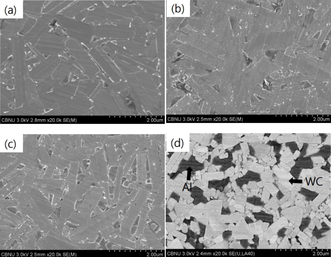 의해 밝은 회색은 텅스텐 카바이드이고 검은 색은 알루미늄이다. 텅스텐 카바이드의 결정립 크기는 알루미늄 첨가량이 증가할수록 작아짐을 알 수 있다.