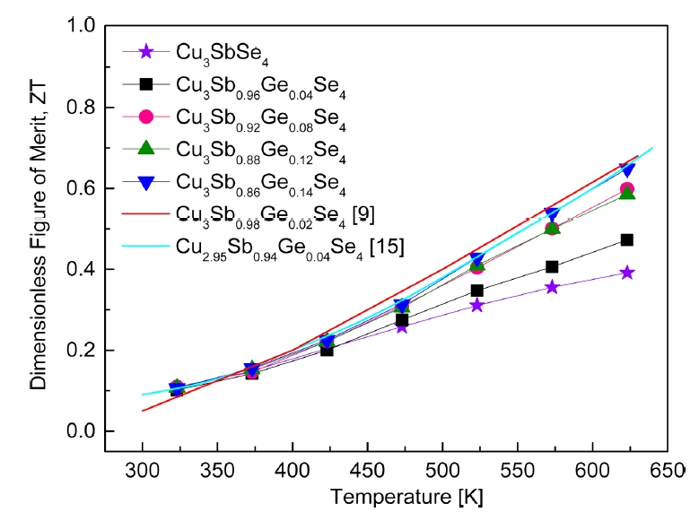 increased because of the increased electronic thermal conductivity. As a result, Cu3Sb0.86Ge0.14Se4 achieved the maximum ZT of 0.65 at 623 K, resulting from its low thermal conductivity