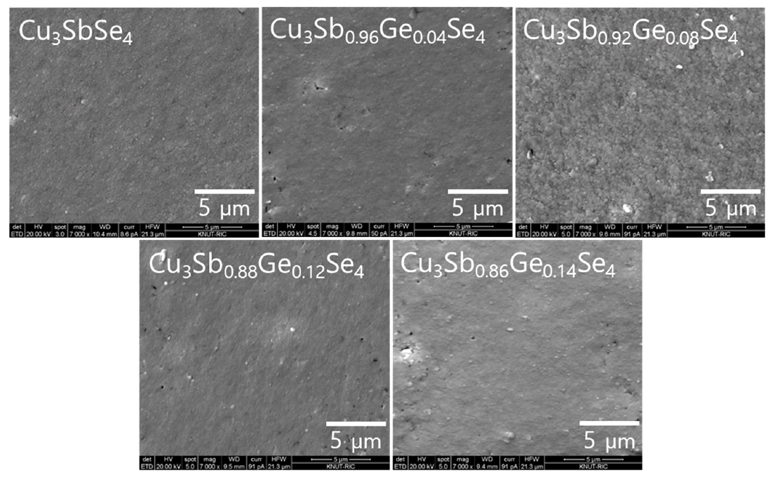 Figure 2 shows the SEM images of the fractured surfaces of the Cu3Sb1−yGeySe4. The hot-pressed compacts showed relative densities of 97.5%–98.3% as shown in Table 1; the theoretical density of permingeatite is 5.82 g·cm−3 [18]. The microstructure did not significantly change with changes in Ge content, however,
