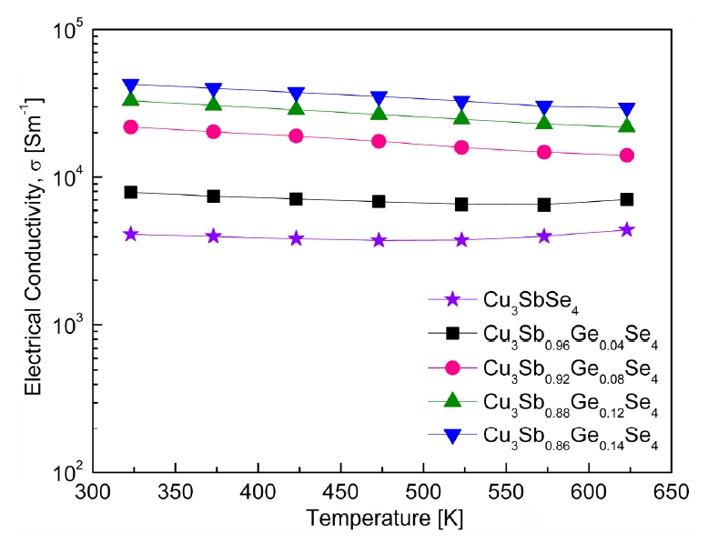doping. For the undoped Cu3SbSe4, the electrical conductivity was (4.2–4.5) × 103 S·m−1 at 323–623 K, whereas the Ge-doped specimens exhibited increased values of (0.8–4.3)