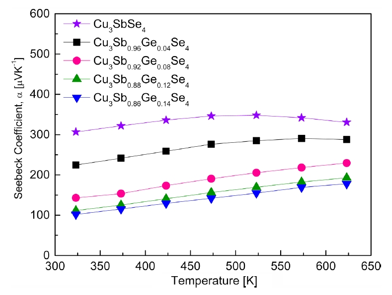 of the Seebeck coefficient and electrical conductivity. The power factor of Cu3SbSe4 was as low as 0.39–0.49 mW·m−1·K−2 at 323–623 K with a small temperature dependence. However, as the Ge content increased,