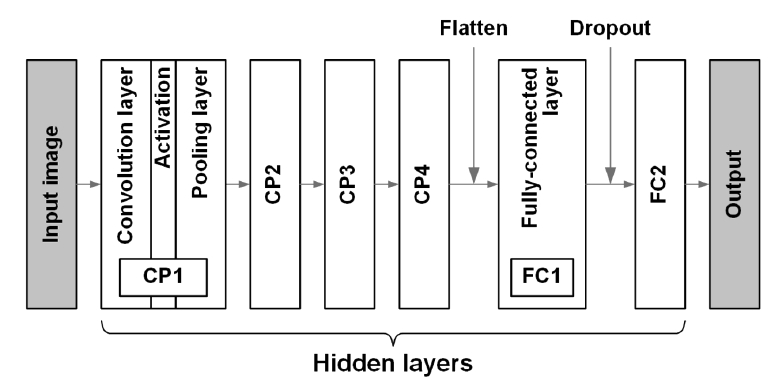 본 연구에서는 지금까지 설명한 합성곱과 활성화함수, 풀링 연산을 합쳐 편의상CP 계층으로 칭한다. 이러한 CP 계층을 중복 연결하고 이미지가 충분히