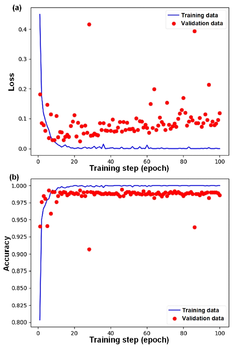Graphs of (a) loss and (b) accuracy for training and validation data during the network