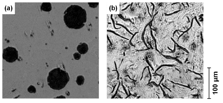 Microstructures of (a) spheroidal graphite cast iron GCD450, and (b) grey cast iron