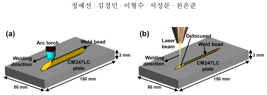 용접(laser beam welding, LBW)을 실시하였다. 그림 1은 (a) GTAW 및 (b) LBW 시험 모식도를 나타낸다. CM247LC 주조재 및 열처리재를 150 × 50 × 3 mm 판재로 가공하여, 비드
