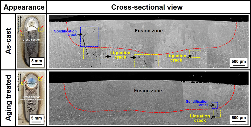 CM247LC 합금 용접부 고온균열 발생 양상을 평가하기 위해 가스 텅스텐 아크용접(gas tungsten arc welding, GTAW) 및 레이저빔