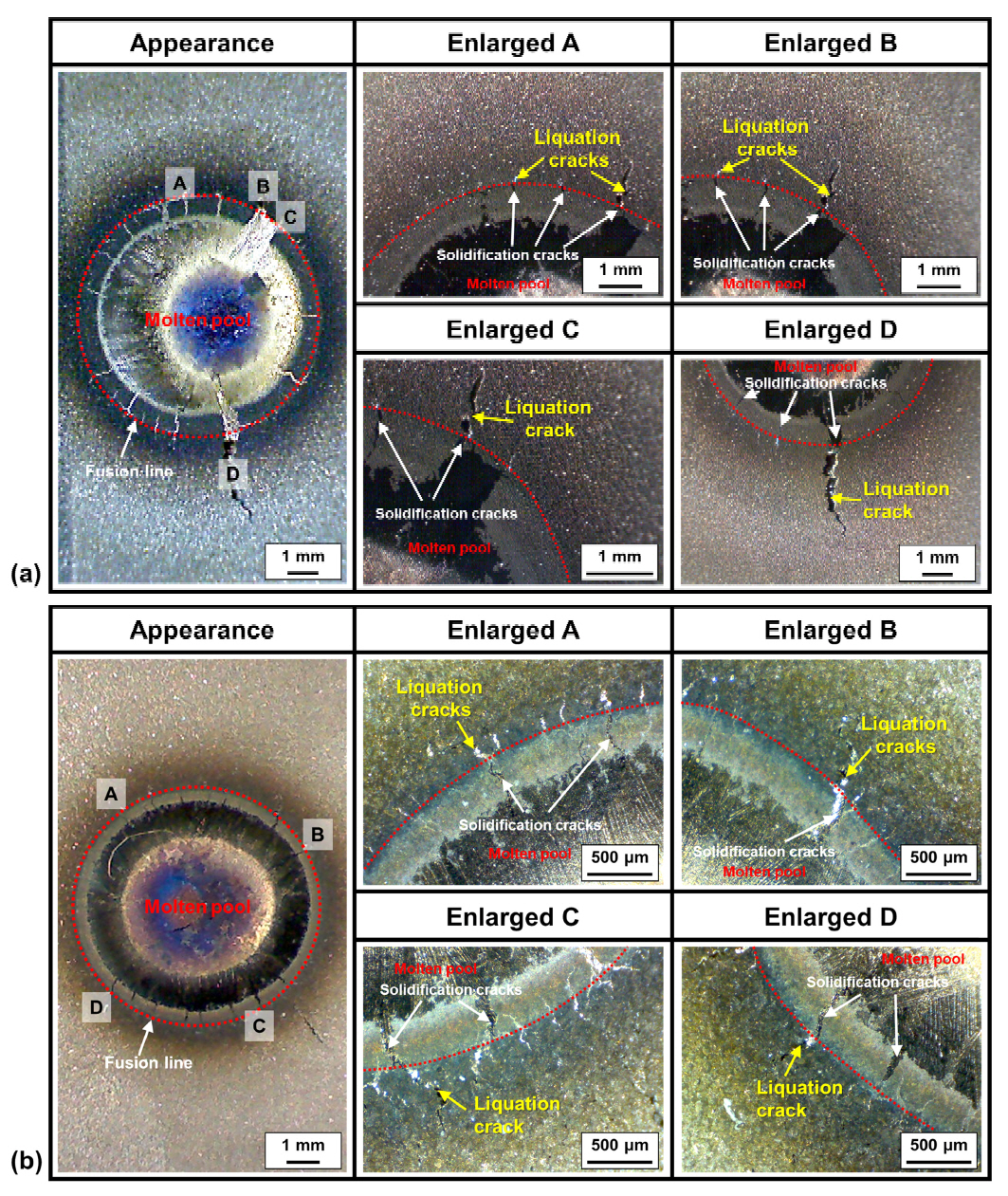 아크 점 용접부 주변으로 고온균열이 형성되었으며, 균열은 형성 위치에 따라 용융지 경계선(fusion line)내의 균열(응고균열)과 열영향부 균열로