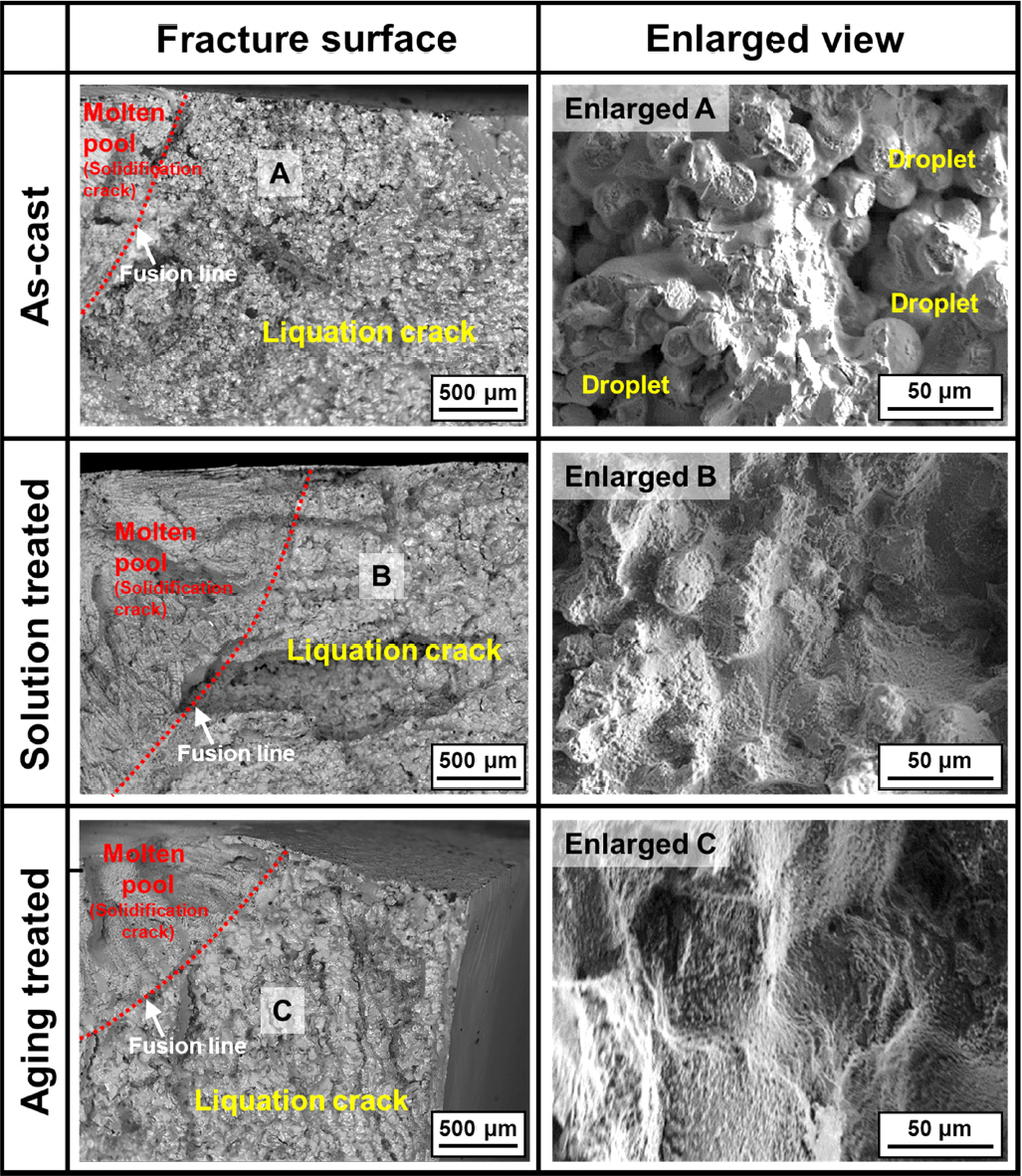 큰 시효 열처리재를 중심으로 다루며, 특히 액화균열 파면상의 성분 분포 분석 위치는 용융지 경계선으로부터 약 500 μm 지점으로 통일하였다 (그림 4 “A, ”C” 영역).