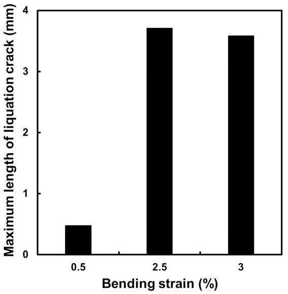 그림 5는 CM247LC 주조재 spot-Varestraint 시험 시의 굽힘 변형률에 따른 최대 액화균열 길이 변화 결과를 나타낸다. 변형률 증가에 따라