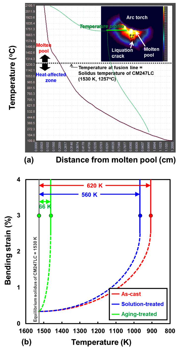 가시화하였으며(그림 2(a)), 해당 결과를 이용해 CM247LC 합금의 액화균열 발생 온도범위(liquation cracking temperature range, LCTR)를