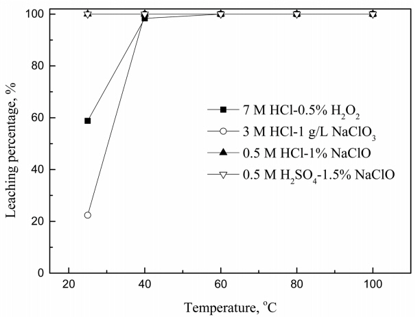 Effect of temperature on the leaching of Pd metal. (25-100 °C; 1 h; Pulp density =