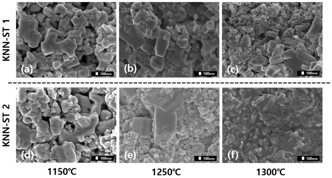 그림 2는 소결온도에 따른 KNN-ST 1, KNN-ST 2의 미세구조를 관찰한 것이다. 그림 2의 (a)와 (d), (b)와 (e)를 비교하면 1150 °C와 1250 °C에서 소결하였을 때 KNNST 2가 크고 작은 입자가 뚜렷한 차이를 보이는