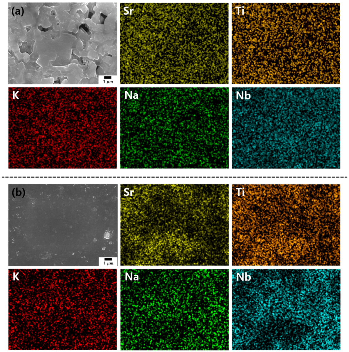 그림 3은 1250 °C에서 소결한 KNN-ST 1, KNN-ST 2의 미세구조를 SEM-EDS mapping 분석으로 관찰한 것이다. KNN-ST의 모든