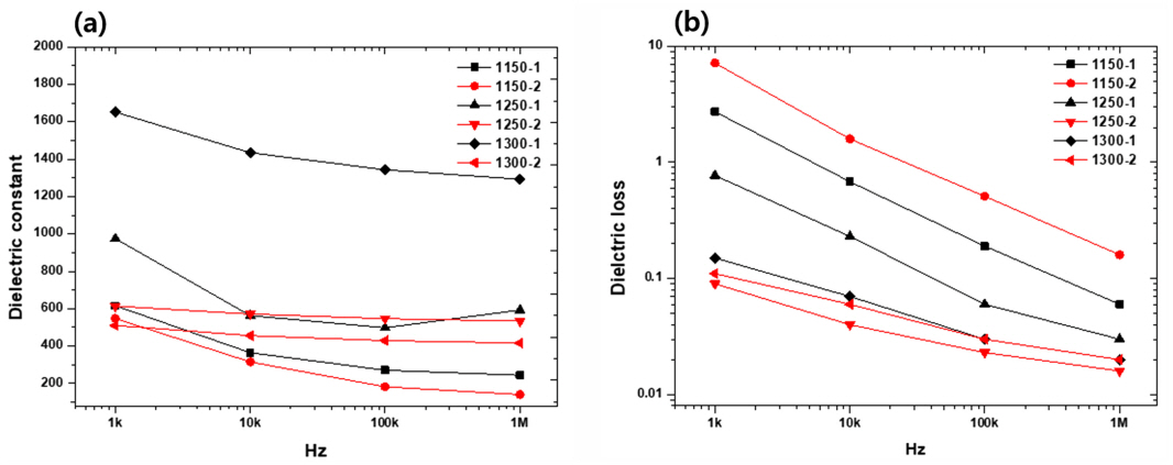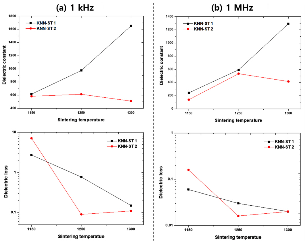 모든 주파수 대역에서 복합체보다 큰 유전 상수 값을 가졌다. 또한 모든 조건에서의 KNN-ST 중에 1300 °C에서 소결한 KNN-ST 고용체가
