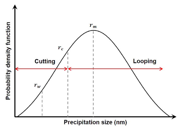 Fang 등은 전위가 하나의 석출물을 지날 때 세 영역을 지날 확률과 영역별 평균 응력을 고려하여 확률 의존적 석출강화효과 식을 제안하였다. 하지만