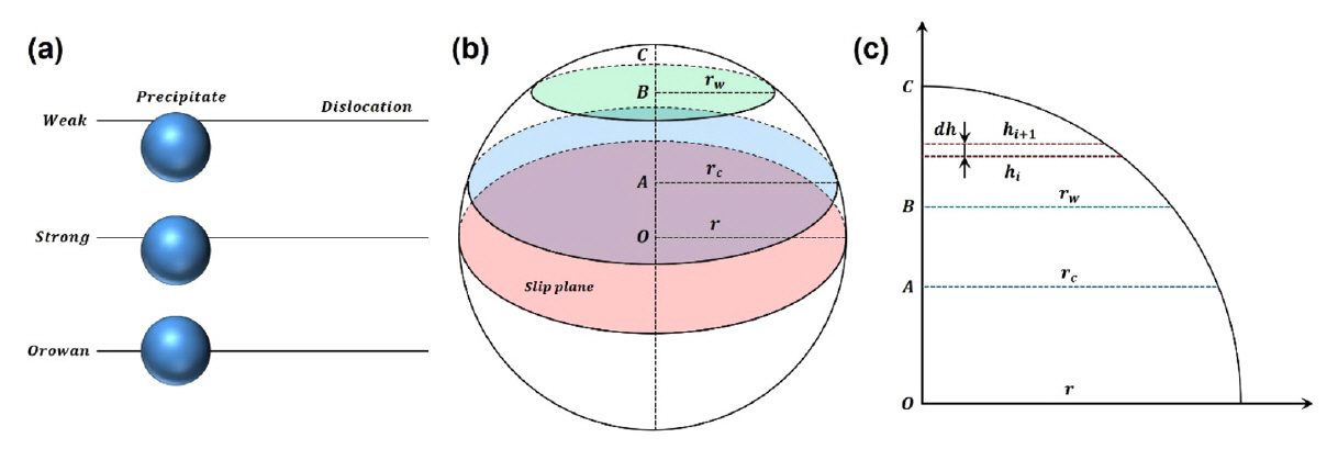 수 있다고 설명하였으며, 이를 그림 4에 나타내었다[22]. 그림 4(a)는 전위가 석출물을 지나는 세가지 경우를 나타낸다. 그림 4(b)는 전위가 석출물을 지날 때 약 쌍 전위 관계, 강 쌍 전위 관계, Orowan 우회 기구로 정해지는 임계 석출물 반지름 크기인 rw, rc 그리고 석출물의 반지름인 r을 나타낸다. 그림 4(c)는 석출물의 단면을 나타내었으며, 전위가 석출물을 지날 때 약 쌍 전위 관계 영역은 B-C 영역 (r<rw, lBC), 강 쌍 전위 관계 영역은 A-B 영역(rw<r<rc, lAB), Orowan 우회 기구 영역은 O-A (rc<r, lOA)영역이다. 전위가 약 쌍 전위 관계 영역을 지날 확률(P1)은 아래의 식 (6)과 같다.