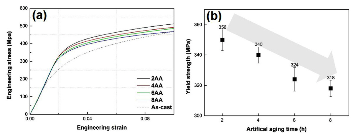 time. (b) Yield strength of the alloys with different artificial aging time.