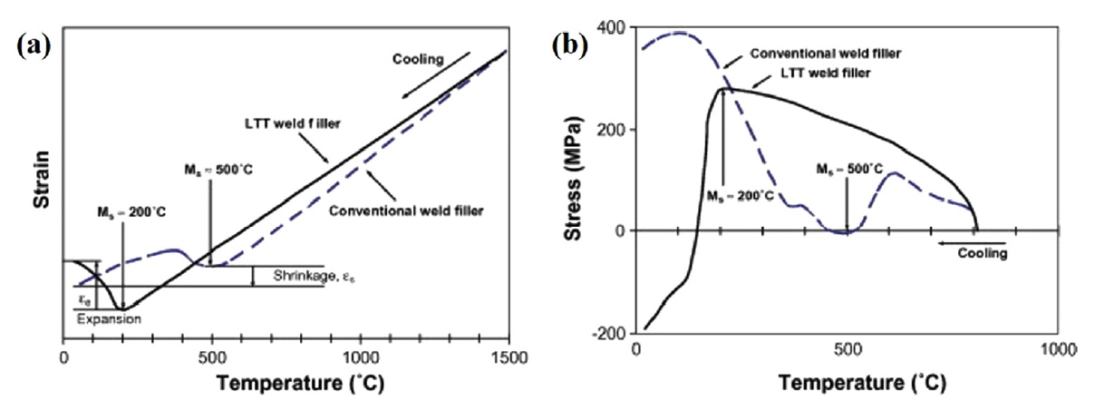 in an LTT welding material with Fe-10Ni-10Cr (wt.%) developed by Ohta et al., phase transformation occurred at 180 °C [14]. This welding consumable could reduce tensile residual stresses or generate compressive