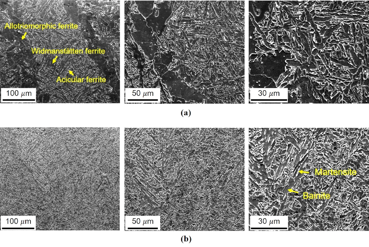 FE-SEM Micrographs in weld metal of sample welded with (a) conventional and (b) LTT