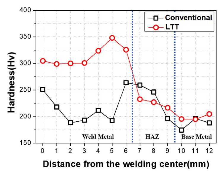 of the LTT weld metal compared to a conventional weld metal. Micro Vickers hardness