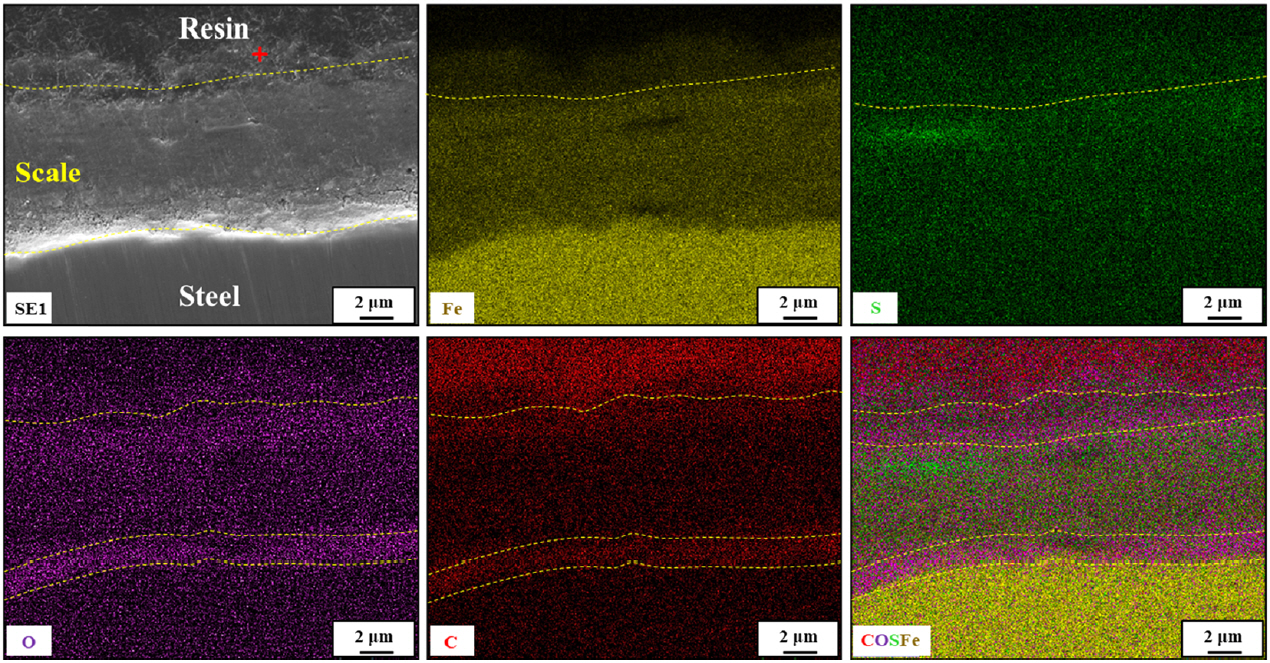 분광분석법(Energy dispersive spectroscopy, EDS)이 사용되었고, 부식생성물의 종류 및 표면으로부터 깊이 별 성분 분포 분석을
