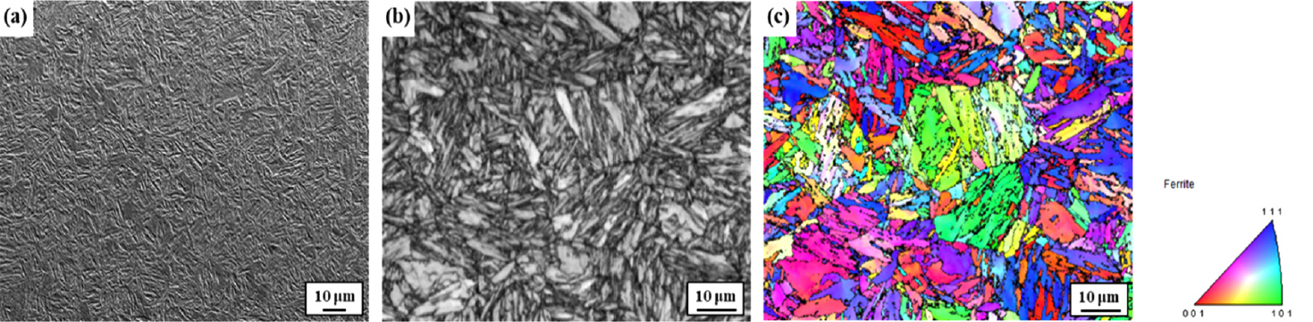 그림 2는 FE-SEM 및 EBSD를 활용하여 분석한 적용 강재의 미세조직을 나타낸다. 기본적으로 lath 타입의 템퍼드 마르텐사이트 조직을 형성하고 있으며,